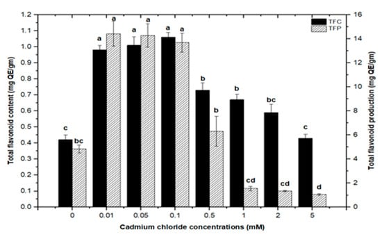 Furthermore, adding greater concentrations of CdCl2 to callus cultures (0.5, 0.1, 2.0, and 5 mM) caused evident toxicity and a decrease in total phenolic synthesis. Maximum comparable values for total flavonoid contents (1.062 mg/g DW), (1.010 mg/g DW), and (0.976 mg/g DW) were found at respective treatments of 0.1, 0.05, and 0.01 mM of CdCl2, as compared with the control. The higher concentrations of CdCl2 (0.5, 1.0, and 2.0 mM of CdCl2) resulted in maximum possible flavonoids accumulations (0.730 mg/g DW), (0.672 mg/g DW), and (0.591 mg/g DW), respectively. However, CdCl2 at 5.0 mM resulted in the least value for total flavonoid content (0.432 mg/g DW), closely similar to that of the control with (0.4225 mg/g DW) of total flavonoid content (Figure 7). For total flavonoid production in CdCl2-treated calli, maximum values for total flavonoid production (14.322 mg/L), (14.306 mg/L), and (13.715 mg/L) were observed at 0.01, 0.05, and 0.1 mM of CdCl2. Previously, many studies have shown CdCl2 as an effective elicitor for optimum phytochemicals production in in vitro cultures of Salvia miltiorrhiza [18], Catharanthus roseus [46], and Datura stramonium [47]. Similar results were also reported by [30,39].