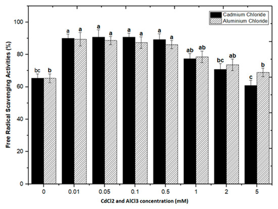 Natural antioxidants are vital substances that can protect organisms from damage caused by oxidative stress generated by free radicals [48]. As a result, plants have evolved a variety of defense measures (antioxidant system) to scavenge the harmful radicals created during oxidative stress, allowing them to survive [13,28,30,49,50]. Variable antioxidant activity in response to heavy metals (AlCl3 and CdCl2) was examined to understand better the influence of heavy metal elicitors on antioxidant activity. Calli elicited with AlCl3 and CdCl2 significantly enhanced the radical scavenging activity by approximately 30% with respect to control cultures (Figure 8). The addition of lower concentrations of AlCl3 to the incubation medium caused a significant increase in antioxidant activity. It showed maximum activities of 89.40%, 88.60%, 87.40%, and 86.10% at 0.01, 0.05, 0.1, and 0.5 mM of AlCl3, respectively, as compared to the control (65.30%).