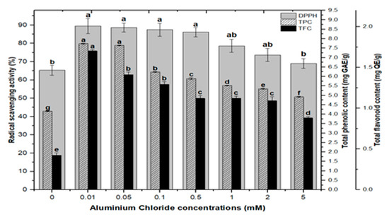 Radical scavenging activity (DPPH %) in comparison with total phenolic contents (TPCs) and total flavonoid contents (TFCs) (correlation ‘r’ DPPH vs. TPC = 0.815 and DPPH vs. TFC = 0.838) in F. indica callus culture elicited with seven different concentrations of aluminum chloride along with control. Bars labeled with different letters (LSD values) exhibit significant variation (α < 0.05).