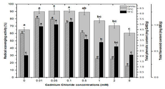 Radical scavenging activity (DPPH %) in comparison with total phenolic contents (TPCs) and total flavonoid contents (TFCs) (correlation ‘r’ DPPH vs. TPC = 0.727 and DPPH vs. TFC = 0.925) in F. indica callus cultures elicited with seven different concentrations of cadmium chloride along with control. Bars labeled with different letters (LSD values) exhibit significant variation (α < 0.05).