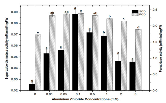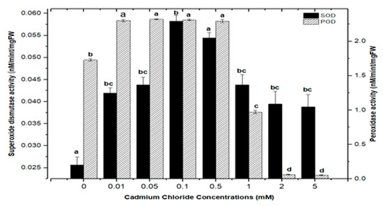 Moreover, the least activities observed were (SOD: 0.045 nM/min/mg FW and POD: 1.895 nM/min/mg FW) in AlCl3 and (SOD: 0.038 nM/min/mg FW and POD: 0.053 nM/min/mg FW) with CdCl2 recorded at a concentration of (5.0 mM) of both elicitors (Figure 11 and Figure 12). Overall, lower doses of both metals as elicitors resulted in increased activities, whereas higher concentrations inhibited the lowest SOD and POD activities. Inactivation of the enzymes due to overproduction of ROS or inactivation of the enzyme by H2O2 in various compartments could explain the reduction in enzymes at higher metal concentrations [56]. Similar results have been reported in different plants where a specific level of Cd produces increases in SOD and POD activities, with higher increases causing a drop in enzymatic activities [52,55,57,58,59,60].