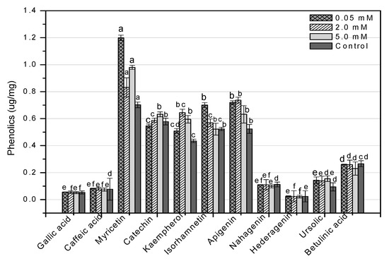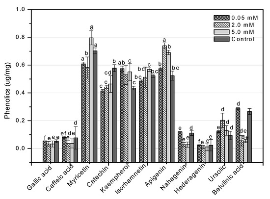 HPLC-based quantification of phenolic compounds in F. indica calli elicited with seven different concentrations of aluminum chloride along with control. Mean values with standard errors (± SE) and bars labeled with different letters (LSD values) exhibit significant variation (α < 0.05).