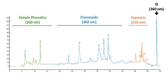 Typical HPLC chromatogram showing the presence of simple phenolics (gallic acid (1) and caffeic acid (2) recorded at 260 nm), flavonoids (catechin (3), myricetin (4), kaempferol (5), isorhamnetin (6), and apigenin (7) recorded at 360 nm), and saponins (hederagenin (8), betulinic acid (9), ursolic acid (10), and nahagenin (11) recorded at 210 nm) in in vitro (callus) culture of F. indica. 5-methoxyflavone (0.2 µg/mL) was used as an internal standard (detection set at 360 nm).