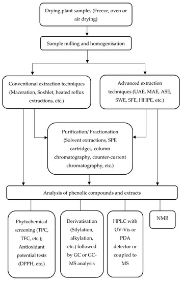 In most cases, extraction is usually followed by purification or fractionation steps to separate the phenolic compounds from other compounds in the extract like carbohydrates and lipids. This can be done by employing solvent extractions, solid-phase extraction cartridges, column chromatography or counter-current chromatography [57]. The schematic diagram in Figure 3 summarises the different steps in the characterisation of phenolic compounds and extracts, from the preparation of plant material through extraction, purification, and subsequent analysis.