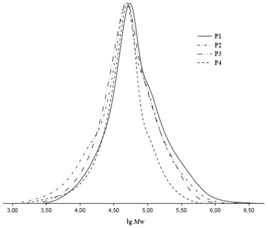 GPC analysis (Figure 2) revealed that average molecular weights and molecular-weight distributions of polymers P1–P4 (Mw = 88,600–123,300, Mw/Mn = 1.56–2.05) were comparable with appropriate characteristics of known ROMP polymers based on monomers 1 and 2 [36,37,38].