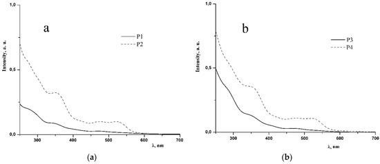 Absorption spectra of P1–P4 copolymers in methylene chloride and water are similar and contain intense bands in the region of 260–350 nm due to π→π* transitions in aromatic systems of ligands linked to iridium and low-intensity bands in the region of 360–550 nm corresponding to metal-to-ligand charge transfer transitions (MLCT) (Figure 4 and Figure S2 and Table 1 and Table S1) [34,35].