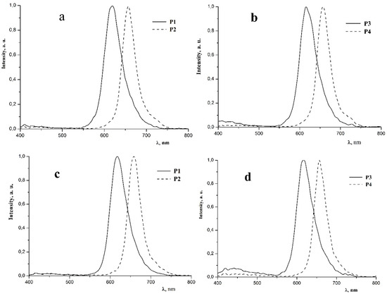 Normalized PL spectra of P1–P4 polymers in (a,b) degassed CH2Cl2 solution and (c,d) degassed aqueous solution at room temperature, λex = 360 nm.