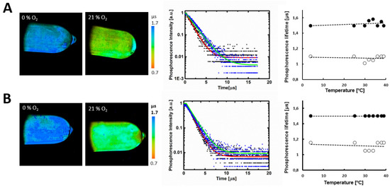 Phosphorescence lifetime measurements for polymers P1 (A) and P3 (B) in degassed and aerated aqueous solutions. λex = 375 nm. Left, PLIM images of the tubes with polymer solutions at room temperature. Middle, representative phosphorescence decay curves. Single exponential fits for degassed (green lines) and aerated (red lines) solutions. Right, dependence of phosphorescence lifetime on the temperature in the range 4–39 °C. Black circles: τ0, white circles: τ.