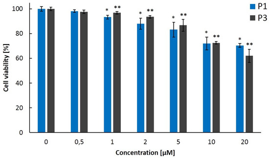 The viability of mouse colon carcinoma cells CT26 after exposure to P1 or P3. The MTT assay was performed in 24 h after adding the polymers to cells. *, ** p < 0.05 vs. controls (0 µM). Mean ± SD (n = 3).