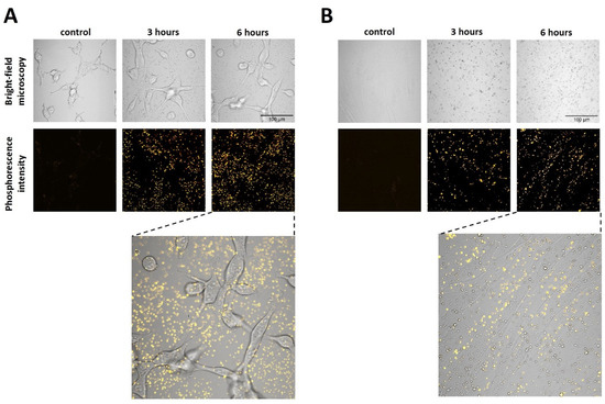 Next, we assessed the ability of the polymers P1 and P3 to penetrate into cultured cancer cells and normal fibroblasts (Figure 8). Cellular uptake was investigated by detecting luminescence signals with laser-scanning microscopy. The polymers P1 and P3 were added to the cells at non-toxic concentrations and luminescence was monitored for 6 h. We showed that P3 did not enter into cancer cells or fibroblasts. The signal came only from the culture medium. For P1, we failed to register luminescence at the experimental conditions used. Previously, a series of Pd- and Pt-based phosphors with greatly restricted ability to penetrate biological membranes was designed by S. Vinogradov’s group [43,44,45]. Although such probes are not applicable for intracellular oxygen measurements, they can quantify oxygen in living tissues when delivered into vasculature or in the interstitial space [46,47].