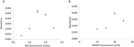 Study of the influence of the NR concentration (A) and NADPH concentration (B) on the enzymatic reduction reaction by calculation of the absorbance signal obtained for a 1.5 mM nitrate standard.