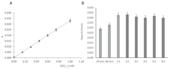 Calibration curve for the nitrate determination obtained with the developed µPAD: (A) calibration curve plotting; (B) calibration curve slope at increasing scanning times; light grey bars represent calibration curves with a correlation coefficient >0.99; dark grey bars represent calibration curves with a correlation coefficient <0.98.