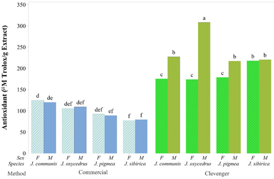 Bar graph of mean antioxidant capacity in μmol Trolox g−1 obtained from the 16 combinations of the extraction method, species and sex. Means sharing the same letter (at the top of the bars) are not significantly different.