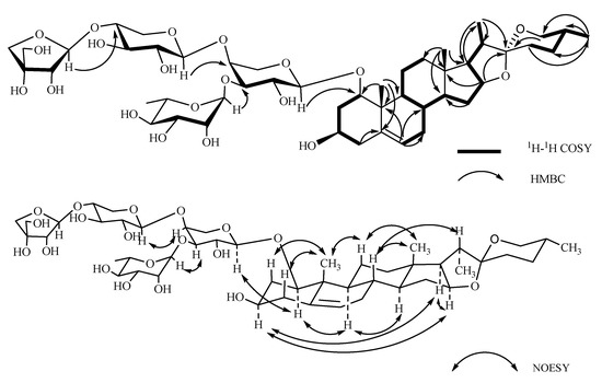 Compound 1, named Pamaiosides A, a white amorphous solid, was positive to Liebermann Burchard and Molisch chemical reactions, which indicates that it might be a steroidal glycoside. The pseudomolecular ion peak was detected in the HR-ESI-MS spectrum at m/z 995.4824 [M + Na]+ (calculated for C48H76O20Na, 995.4828), corresponding to the molecular formula C48H76O20. Four methyl groups were tested in the 1H-NMR spectrum at δH 0.82 (3H, s, H-18), 1.12 (3H, s, H-19), δH 0.80 (3H, d, J = 6.35 Hz, H-27), and 0.96 (3H, d, J = 6.90 Hz, H-21). Meanwhile, one olefinic methine proton signal was observed at δH 5.56 (1H, br s, H-6). The hydrogen signals above suggest a steroid skeleton [11,12]. Correspondingly, in the 13C-NMR spectrum of 1, four carbon signals of methyl groups were revealed at δC 17.65 (C-18), 15.52 (C-19), 17.29 (C-27), and 15.07 (C-21) as well as one trisubstituted double bonds at δC 139.71 (C-5) and 126.17 (C-6). A characteristic hemiacetal signal of spirostanol aglycone was discovered at δC 111.74 (C-22) [11]. In the HMBC spectrum, the cross-peaks between H-4 (δH 1.90) and C-5 (δC 139.71), H-19 (δH 1.12) and C-5 (δC 139.71), and H-6(δH 5.56) and C-8 (δC 34.26)/C-10 (δC 43.58) inferred that the double bond was located at C-5/C-6 (Figure 2). In the NOESY spectrum, the correlation between H-1 (δH 3.37) and H-9 (δH 1.25) and H-3 (δH 3.34) and H-9 (δH 1.25) suggested that the configurations of H-1 and H-3 were an α-orientation, so that the hydroxyl substituent at C-1 and C-3 were both β configuration. The correlation between H-3 (δH 3.34) and H-16 (δH 4.38)/H-17 (δH 1.72), between H-16 (δH 4.38) and H-17 (δH 1.72), between H-8 (δH 1.56) and H-18 (δH 0.82), between H-19 (δH 1.12) and H-11 (δH 1.42), and between H-9 (δH 1.25) and H-14 (δH 1.15) elucidate the usual trans junction for the B/C and C/D rings. The correlations between H-8 (δH 1.56) and H-20 (δH 1.90) infer that C-20 was an S configuration. In the spirostanol saponins, when the resonance of the proton H-20 was observed at a lower field than approximately δH 2.48, the orientation relationship between the proton of H-20 and the oxygen atom included in the F ring was thought to be located at the cis position. On the other hand, when the proton shifts of H-20 were detected at a higher field than δH 2.20, the orientation relationship is thought to be trans [13,14]. In this way, the orientation relationship of the F ring was considered to be trans, and the configuration of C-22 was confirmed as R. The 25R configuration was determined by the chemical shift difference between H-26a and H-26b (∆ = δHa  δHb = 3.43 − 3.30 = 0.13 < 0.48) [15,16]. By combining the data and consulting the literature [17], the aglycone of compound 1 was identified as (20S,22R,25R)-spirost-5-en-1β,3β-diol.