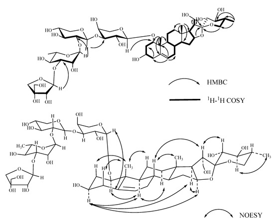 Acid hydrolysis, derivatization, and GC analysis revealed that compound 2 possessed the same monosaccharide residues as 1, but different linkages emerged between the sugars. In the HMBC spectra, the sugar sequencing linkages were testified by the correlations between Api H-1 (δH 5.21) and Rha C-3 (δC 80.45), Rha H-1 (δH 5.33) and Xyl C-2 (δC 74.89), Xyl H-1 (δH 4.43) and Ara C-3 (δC 85.25), and Ara H-1 (δH 4.34) and C-1 (δC 84.80). Thus, compound 2 was elucidated as (20R,22R,25R)-spirost-5-en-1β,3β,21,23α,24β-pentol-1-O-β-d-apiofuranosyl-(1→3)-α-L-rhamnopyranosyl-(1→2)-d-xylopyranosyl-(1→3)-a-L-arabinopyranoside.
