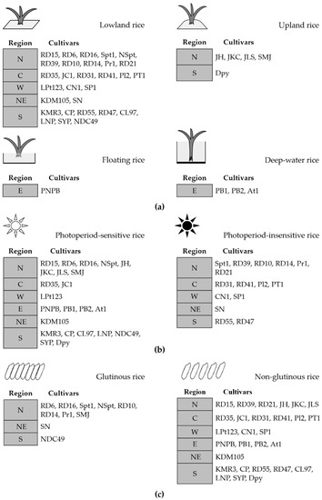 | No. | Rice Cultivar | Abbreviation | Location of Rice Research Center |