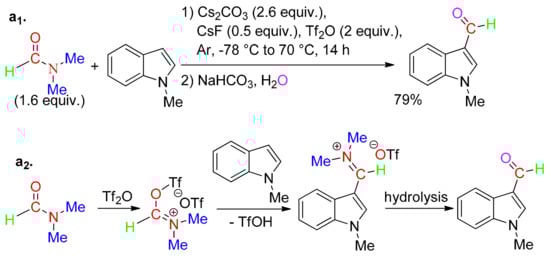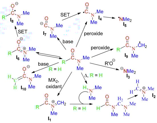The purpose is now to highlight the recent literature, focusing on atom transfer from DM to substrates. A few older reports, useful to place the subject in the appropriate context, or omitted in the previous reviews are included. The processes which necessitate the prerequisite synthesis of DM derivatives such as the Vilsmeier–Haack reagents [8,9] and DMF dimethyl acetal [10] are discarded. Color equations, based on literature proposals, allow easily visualizing the DM atom(s) origin. DM may act as a nucleophilic or electrophilic reagent; neutral, ionic, and radical species, such as those depicted in Scheme 1, may be key intermediates. The reaction mechanisms will be, at best, briefly commented on.
