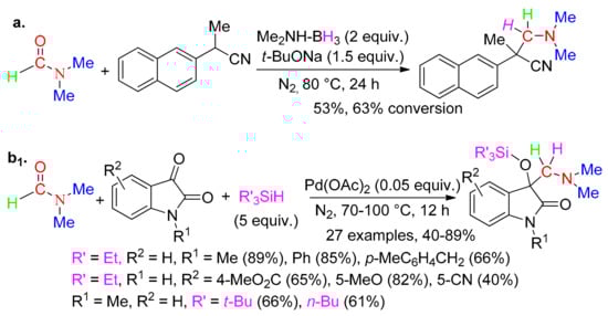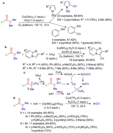 N,N-dimethylformamide; DMF; N,N-dimethylacetamide; DMAc; amination; amidation; formylation; cyanation; insertion; cyclization 1. Introduction