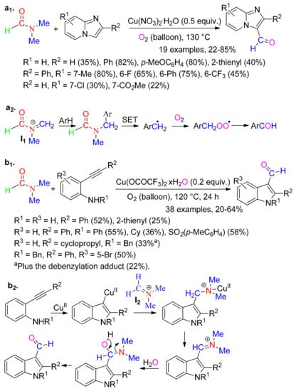 When carried out in the absence of ammonium iodide, the above Cu-mediated reaction of imidazo [1,2-a]pyridines led to the formylation of the C3–H bond (Scheme 3(a1)) [12]. The Jiang/Ji team suggested the nucleophilic addition of the substrate to I1 followed by homolytic cleavage of the C–N bond (Scheme 3(a2)). Trapping the radical species with oxygen affords a peroxy radical, the decomposition of which gives the product.