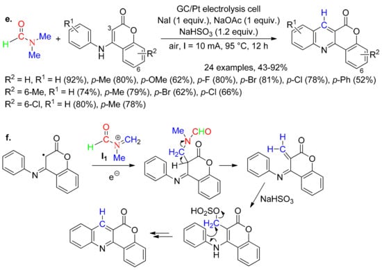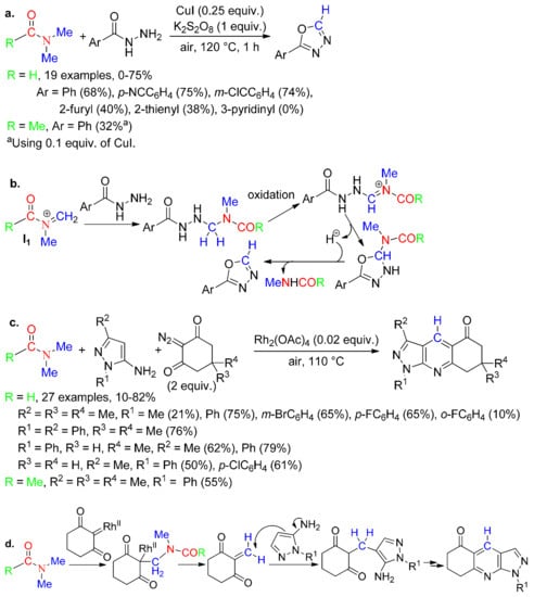 The S. Zhang/Jiang/Jia [21], Xie/Wang/Shang [22], and Weng/Ackermann [23] teams reported annulations with the insertion of a methine fragment (Scheme 4). The addition of hydrazide to I1 is the key step to produce the 1,3,4-oxadiazole (Scheme 4a,b) [21] while the synthesis of the pyrazolo[3,4-b]pyridines derivatives (Scheme 4c) [22] is, in fact, due to a Friedel–Crafts-type nucleophilic addition of pyrazol-5-amine to the 2- methylenecyclohexane-1,3-dione (Scheme 4d). The latter is formed by coordination of diazo compound to the Rh catalyst leading to a rhodium-carbene which inserts into a C–H bond of DM, subsequent β-nitrogen elimination delivering the methylene dione and RCONHMe. The recent cyclization of 4-arylaminocoumarins (Scheme 4e) [23] involves the electrochemically NaI-mediated formation of I1 and a radical derivative of the substrate which react together afford the coumarin derivative substituted with CH2NMeCOH (Scheme 4f). Elimination of HCONHMe and subsequent NaHSO3-mediating cyclization followed by aromatization provide 6H-chromeno[4,3-b]quinolin-6-one.
