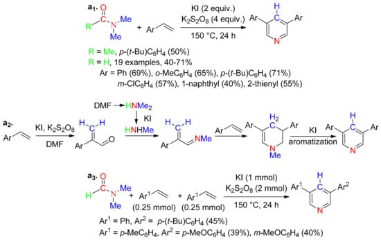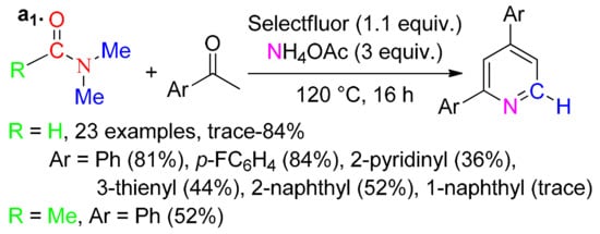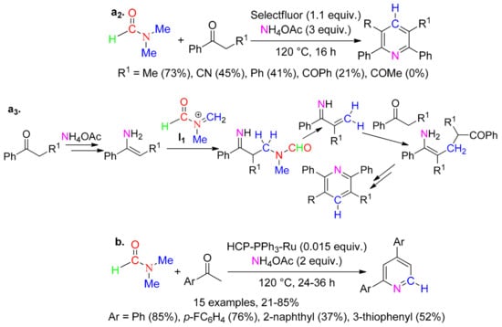 An annulation reaction involving the insertion of a nitrogen atom and a CH fragment has been reported from the heating of aromatic ketones (ArCOCH2R1) in DMF or DMAc in the presence of ammonium acetate and Selectfluor (Scheme 5(a1,a2)) [24]. The key step leading to symmetrical pyridines (Scheme 5(a2)) is the nucleophilic addition of the vinylamine ArC(NH2)=CHR1 formed from the substrate and ammonium acetate, to I1 formed from DMF and Selectfluor (Scheme 5(a3)). The resulting intermediate Ar(C=NH)CHR1-CH2NMeCOH undergoes elimination of HNMeCOH giving Ar(C=NH)CR1=CH2. A nucleophilic attack of the latter by ArCOCH2R1 is followed by annulation and aromatization. The unsymmetrical pyridines (Scheme 5(a1)) are formed via a rather similar mechanism which starts with homo-condensation of the substrate. The synthesis of 2,4-diphenylpyridine from acetophenone, NH4Oac, and DMF or DMAc using NH4I instead of Selectfluor was previously reported but in no more than 6% yield [25]. In contrast, the synthesis of such compounds was efficiently catalyzed using RuCl3 [3,26] or a recyclable hypercrosslinked polymer-immobilized ruthenium catalyst noted as HCP–PPh3–Ru (Scheme 5b) [27].