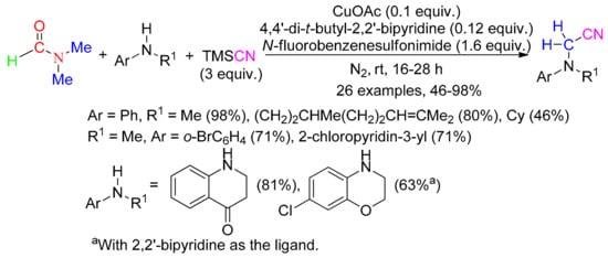 Copper acetate associated with N-fluorobenzenesulfonimide promoted an efficient one-pot three-component condensation leading to α-amino nitriles (Scheme 6) [28]. The reaction involves the addition of a secondary aromatic amine to I1, giving ArNR1CH2NMeCOH which is converted into ArNR1=CH2⊕ via cleavage of the CH2–NMe bond. Subsequent reaction of the iminium ion with TMSCN provides the α-amino nitrile.