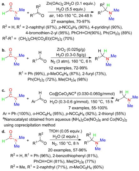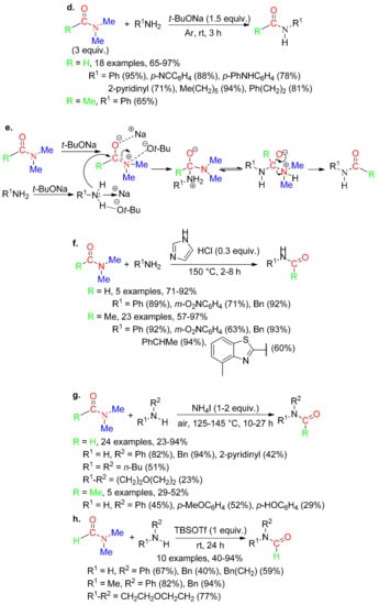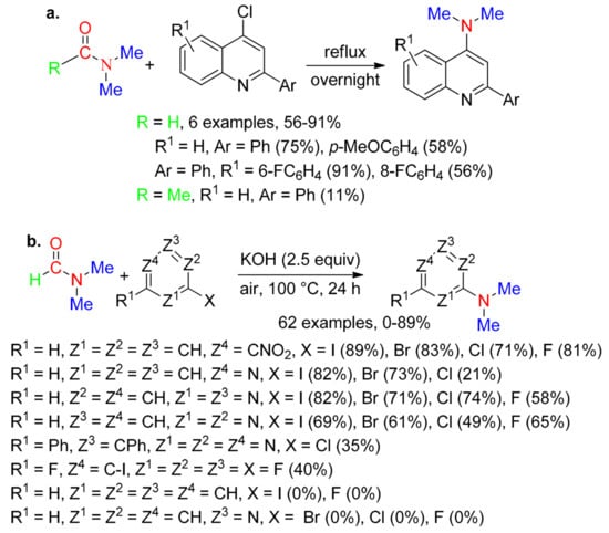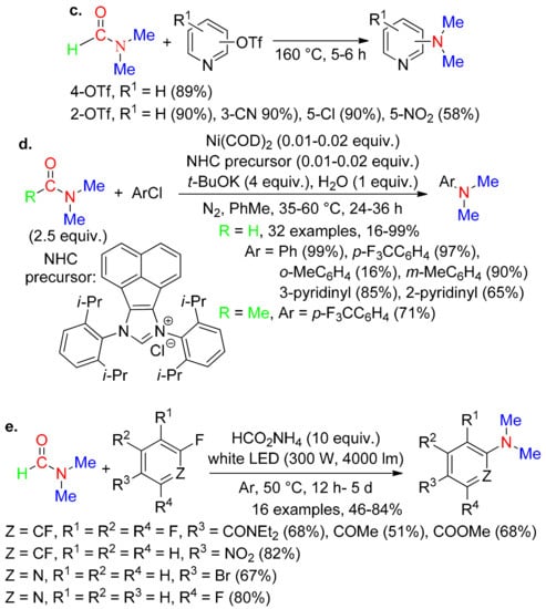 The amination of (hetero)aryl halides or tosylates with DM has been carried out under various conditions (Scheme 7) [29,30,31,32]. With DMF, these reactions could occur via reaction of the substrate with HNMe2 produced from thermal or catalytic decomposition of DMF. Under basic conditions, an aromatic nucleophilic substitution (SNAr) process has been discarded and Gong’s team pointed out that the mechanism is unclear [30]. Under the experimental conditions of Scheme 7d, Ni-catalyzed-activation of the C–N bond of DM could participate in the process [33,34], but the presence of water could disfavor the coordination of DM to the transition metal [35]. Cleavage of the C–N bond of amides may, however, arise under transition-metal-free conditions [36].