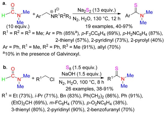 Various N,N-dimethyl thioamides have been synthetized under aqueous conditions from DMF and quaternary (hetero)benzyl ammonium iodides (Scheme 8a) [38] or primary (hetero)benzyl/alkyl chlorides (Scheme 8b) [39] using sodium disulfide or elemental sulfur and NaOH, respectively. The mechanism of these reactions is unclear. N,N-Dimethylbenzothioamide was not detected using N,N,N-dimethyl benzylamine instead of benzyl N,N,N-trimethyl ammonium iodide, and isolated in only 10% yield from the ammonium salt in the presence of a radical scavenger (Scheme 8a). According to Cheng’s team, the reaction leading to ArC=SNR3 involves radical cross-coupling between ArC∙HNR2 and Me2N∙ leading to ArCH(NR2)(NMe2) which evolves toward the corresponding imminium before undergoing addition of sulfur species, while Ge, Zhou, and co-workers, on the basis of controlling experiments and quantum chemical calculations, assumed a thioamidation of R1CH2Cl arising via the base-mediated formation of R1C⊖HCl followed by addition to a S7 cluster and then reaction with DMF.