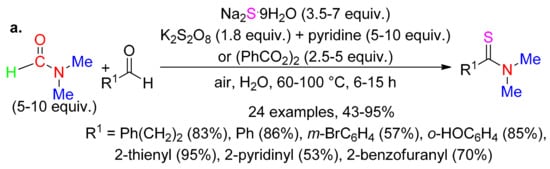 Jiang and co-workers reported a procedure also leading to thioamides, but based on the use of alkyl or aryl aldehydes, DMF, and sodium sulfide under aqueous oxidation conditions (Scheme 9a) [40]. According to the proposed mechanism, aqueous sodium sulfide mediates the cleavage of C–N bond providing HNMe2 and H2S. The addition of sulfur anion to R1CH=N⊕Me2 formed from the condensation of R1CHO with HNMe2, followed by oxidation leading to the thioamide.