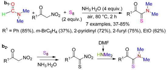 Denitration of nitroketones mediated with sulfur and aqueous trimethylamine in DMF provided α-ketothioamides (Scheme 9(b1)) [41]. Zhang and co-workers proposed that the ketothiolation of the substrate is followed by nucleophilic attack of dimethylamine produced from decarbonylation of DMF (Scheme 9(b2)).