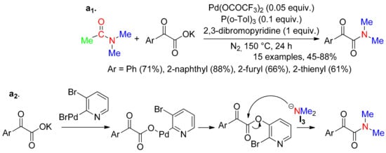 Halopyridines, especially 2,3-dibromopyridine, promote the Pd-catalyzed amidation of arylglyoxylates with DMAc (Scheme 10(a1)) [42]. The reaction occurs via Pd-catalyzed esterification of the carboxylate with the halopyridine followed by amidation of the resulting ester with I3 (Scheme 10(a2)), the latter being issued from the addition of the in situ formed 2-bromopyridin-3-olate to DMAc.