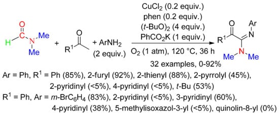 The Liu/Guo team disclosed the synthesis of 2-oxo-acetamidines from a mixture of methyl ketones and anilines in DMF containing peroxide, base, and CuII catalyst under oxygen atmosphere (Scheme 11) [43]. According to control experiments, R1COCH2NMe2 produced from radical pathways involving the carbamoyl radical I4 and the aminyl radical I5, is an intermediate of the reaction.