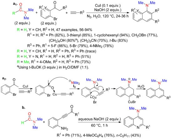 A CuI-catalyzed benzannulation leading to functionalized N,N-dimethylnaphthalen-1-amines or N,N-dimethylquinolin-8-amine was reported under basic conditions by the Yuan/Zhou team using DM, bromo-(hetero)aryl ketones, and terminal alkynes in water (Scheme 12(a1)) [44]. One of the key steps would be the addition of I3 to the alkynylCu-coordinated carbonyl of the ketone (Scheme 12(a2)).