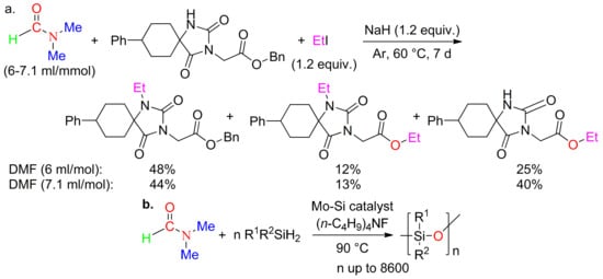 Catalysis with silyl-molybdenum complexes of the polymerization of dihydroorganosilanes in DMF led to the participation of the DMF-oxygen atom affording polysiloxanes (Scheme 14b) [50].