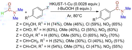 The oxidation in DMF of benzyl alcohol, benzaldehyde, benzoic acid, styrene, phenyl acetylene, and corresponding p-substituted substrates using a mesoporous copper catalyst named HKUST-1-Cu led to cleavage of the Ar-function bond giving N,N-dimethylarylamides (Scheme 16) [59].