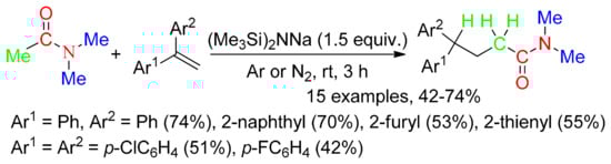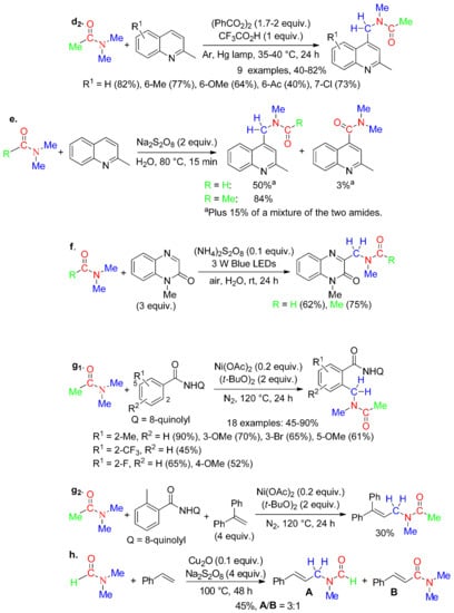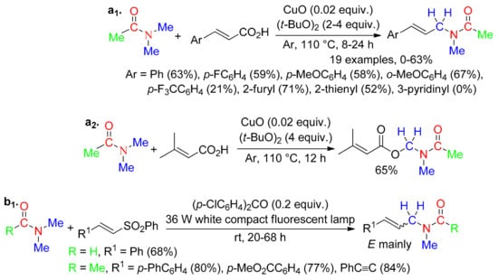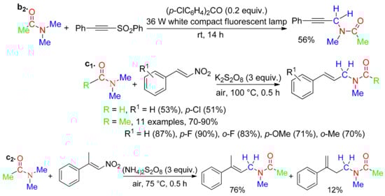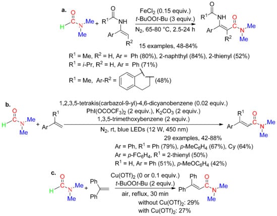 The carbamoylation of the double bond of enamides and styrenes with DMF arose under oxidative conditions mediated with Fe catalysis at 65–80 °C (Scheme 17a) [60] or visible light at room temperature (Scheme 17b) [61], respectively. Refluxing 1,1-diphenylethylene in DMF with di-tert-butyl peroxide led to a low yield of N,N-dimethyl-3,3-diphenylacrylamide even under Cu catalysis (Scheme 17c) [62].
