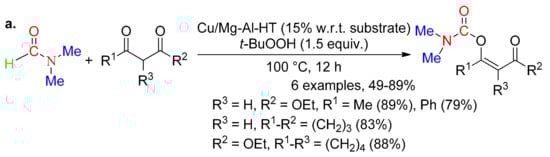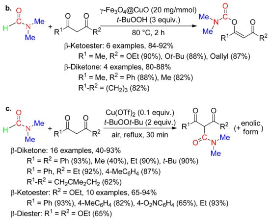 In the presence of peroxides, the reaction of β-dicarbonyl compounds with DMF under catalysis with either a copper supported Mg–Al hydrotalcite derived oxide (Scheme 18a) [63] or a maghemite–copper oxide nanocomposite (Scheme 18b) [64] afforded enol carbamates, while a soluble catalyst—Cu(OTf)2—gave, according to Zou’s team, 2-carbamoyl-1,3-dicarbonyl compounds (Scheme 18c) [62]. Given the NMR chemical shifts attributed to the latter, especially those of the putative 2-benzoyl-N,N-dimethyl-3-oxo-3-phenylpropanamide, the right structure is not obvious and remains an open question. Mail sent to J.-P. Zou remained without an answer.