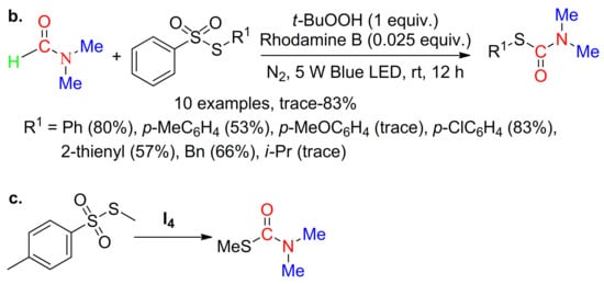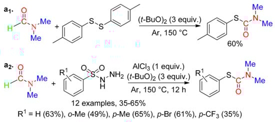 Mao, Zhang, and co-workers reported the thiolation of the C–H bond of DMF using di-tert-butyl peroxide and either 1,2-di-p-tolyldisulfane (Scheme 19(a1)) or arylsulfonyl hydrazides and aluminum chloride (Scheme 19(a2)) [65], while Bi, Feng, Geng, and co-workers recently used tert-butyl hydroperoxide and S-aryl arenethiosulfonates under visible-light irradiation (Scheme 19b) [66]. This last procedure is, however, ineffective for DMF thiolation with 1,2-di-p-phenyldisulfane [66]. According to the authors [65,66], these reactions involve the radical I4. Jia’s team, in the course of the study of functionalization of styrenes with thiosulfonates and arylboronic acids in acetone/DMF, also proposed that S-methyl dimethylcarbamothioate isolated as a by-product was formed from the reaction of S-methyl 4-methylbenzenesulfonothioate with I4 (Scheme 19c) [67].