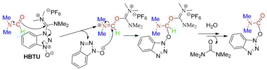 Hexafluorophosphate benzotriazole tetramethyl uronium (HBTU) is a peptide coupling reagent frequently used [69,70,71]. An impurity with an abundance of 0.09% was detected by Badalassi and co-workers in the Peptide Q API solution obtained from the HBTU-mediated Peptide Q cyclization in DMF [72]. This impurity was identified as being 1H-benzo[d][1–3]triazol-1-yl dimethylcarbamate formed from the addition of DMF to HBTU as depicted in Scheme 21.