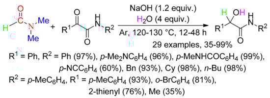 The chemoselective reduction of α-ketoamides arose from treatment with sodium hydroxide and water in DMF (Scheme 22) [73]. Deuterium labeling experiments led Wu and co-workers to assume hydride delivery from HCOONa produced from the hydrolysis of DMF with hydrated NaOH.
