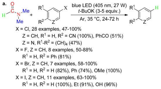 The association of t-BuOK, DMF, and visible-light irradiation mediated the dehalogenation of (hetero)aryl fluorides, chlorides, bromides, and iodides (Scheme 23a) [74], while the reductive cleavage of 4-methoxybenzenediazonium tetrafluoroborate occurred under light-free conditions (Scheme 23b) [75]. According to Qu/Kang’s and Taillefer’s teams [74,75], these reactions implicate the carbamoyl anion I7 and, via electron transfer, the carbamoyl radical I4. Such a reactivity of DMF under t-BuOK conditions has been exploited for transition-metal-free Matsuda–Heck type reactions [75].