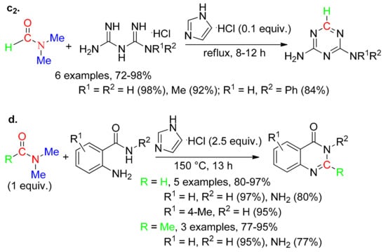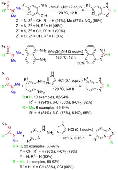 Heterocycles containing the CR fragment have been synthetized from a variety of amino substrates (Scheme 24) [76,77,78,79]. Under the experimental conditions of Scheme 24a, activation of the carbonyl group of DMF by HMDS favors the nucleophilic addition of the arylamine leading to an intermediate that undergoes internal addition of the other nucleophilic moiety of the substrate. In the presence of imidazolium chloride (Scheme 24b–d), the addition of imidazole to HCl-activated carbonyl of DM leads to C3H3N2COR which undergoes nucleophilic addition with the substrate.