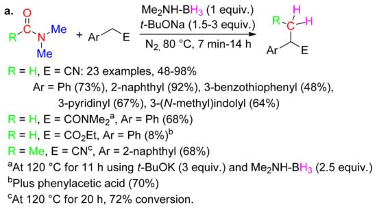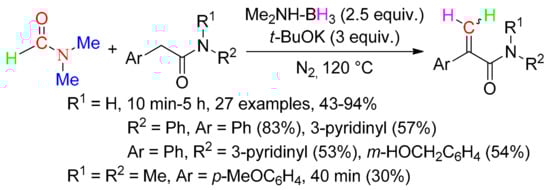 - Liu, Y.; Wang, C.-L.; Xia, H.-M.; Wang, Z.; Wang, Y.-F. Direct Csp3–H methylenation of 2-arylacetamides using DMF/Me2NH-BH3 as the methylene source. Org. Biomol. Chem. 2019, 17, 6153–6157. [Google Scholar] [CrossRef]