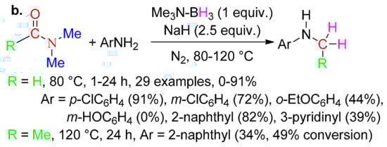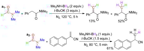 - Xia, H.-M.; Zhang, F.-L.; Ye, T.; Wang, Y.-F. Selective α-monomethylation by an amine-borane/N,N-dimethylformamide system as the methyl source. Angew. Chem. Int. Ed. 2018, 57, 11770–11775. [Google Scholar] [CrossRef]
