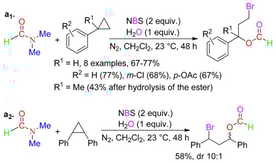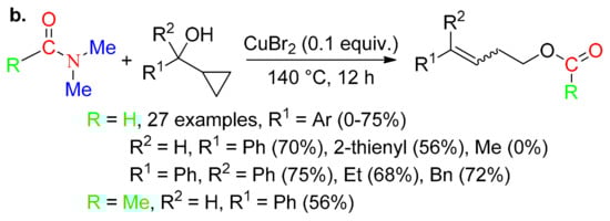 - Zhuang, D.; Gatera, T.; Yan, R. CuBr2-catalyzed ring opening/formylation reaction of cyclopropyl carbinols with DMF to synthesize formate esters. Tetrahedron Lett. 2020, 61, 152506. [Google Scholar] [CrossRef]
