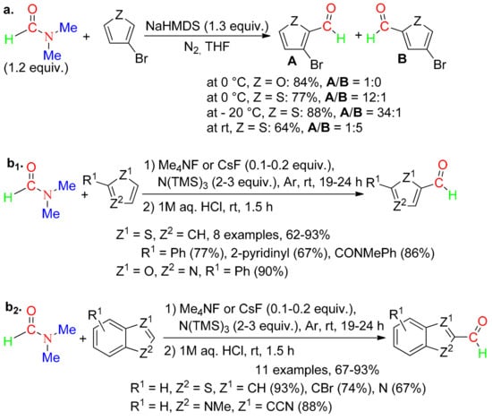 - Shigeno, M.; Fujii, Y.; Kajima, A.; Nozawa-Kumada, K.; Kondo, Y. Catalytic deprotonative α-formylation of heteroarenes by an amide base generated in situ from tetramethylammonium fluoride and tris(trimethylsilyl)amine. Org. Process Res. Dev. 2019, 23, 443–451. [Google Scholar] [CrossRef]