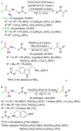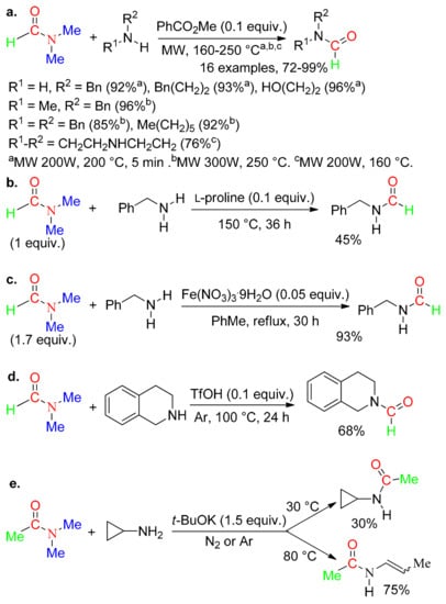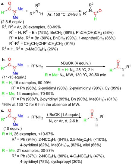- Yin, J.; Zhang, J.; Cai, C.; Deng, G.-J.; Gong, H. Catalyst-free transamidation of aromatic amines with formamide derivatives and tertiary amides with aliphatic amines. Org. Lett. 2019, 21, 387–392. [Google Scholar] [CrossRef]