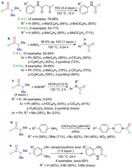 - Zhang, Q.; Chen, C. Direct Acylation of aryl amines using dimethylformamide and dimethylacetamide as the acyl resources. J. Saudi Chem. Soc. 2016, 20, 114–119. [Google Scholar] [CrossRef] [Green Version]