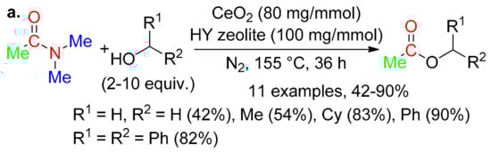 - Toyao, T.; Rashed, M.N.; Morita, Y.; Kamachi, T.; Siddiki, S.M.A.H.; Ali, M.A.; Touchy, A.S.; Kon, K.; Maeno, Z.; Yoshizawa, K.; et al. Esterification of tertiary amides by alcohols through C–N bond cleavage over CeO2. ChemCatChem 2019, 11, 449–456. [Google Scholar] [CrossRef]