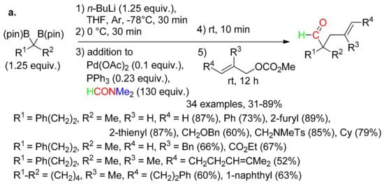 - Zheng, P.; Zhai, Y.; Zhao, X.; Xu, T. Palladium-catalyzed cross-coupling of gem-bis(boronates) with aryl halides: An alternative to access quaternary α-aryl aldehydes. Org. Lett. 2019, 21, 393–396. [Google Scholar] [CrossRef]